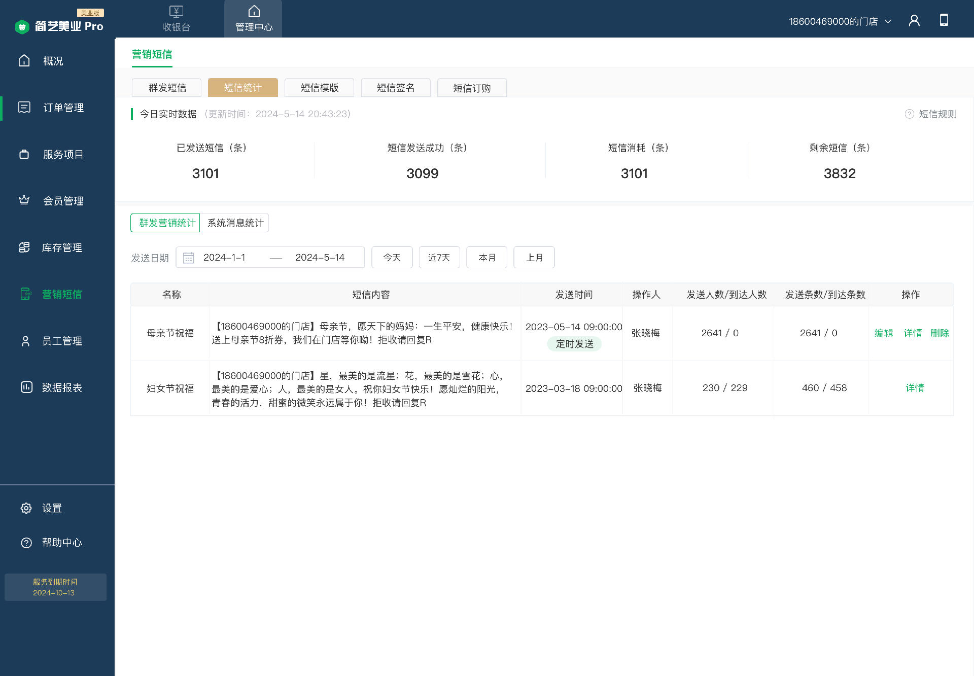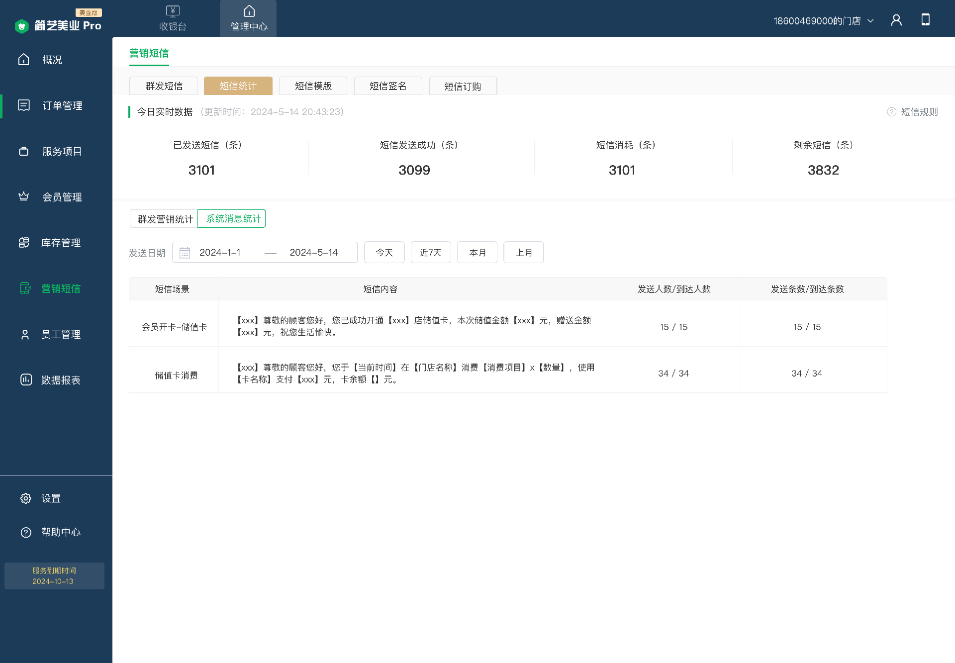 1)實(shí)時(shí)數(shù)據(jù):門店自購買短信包起的短信實(shí)時(shí)數(shù)據(jù),包含已發(fā)送短信、短信發(fā)送成功條數(shù)、短信消耗條數(shù)、剩余短信條數(shù)