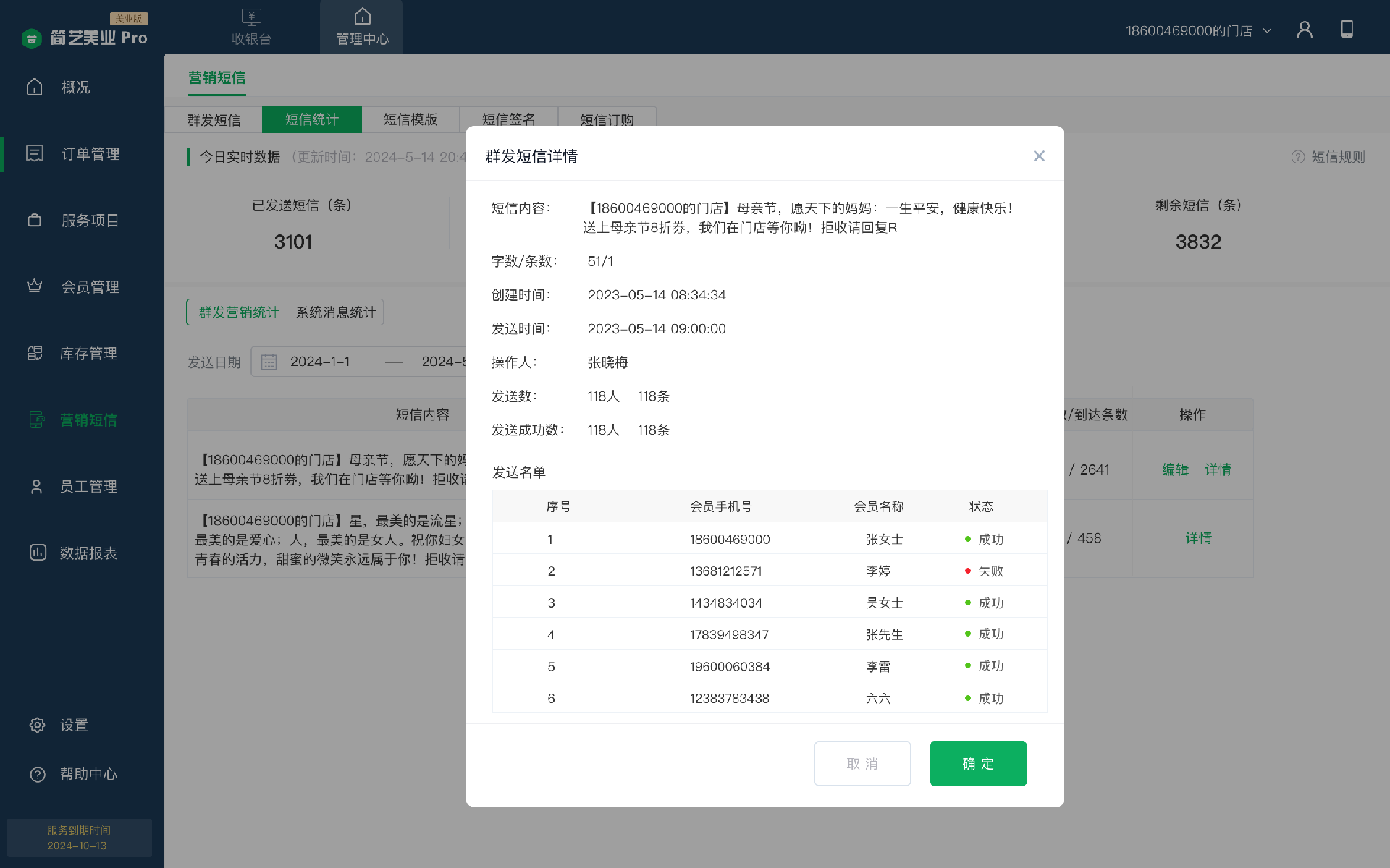 2)群發(fā)營(yíng)銷短信:手動(dòng)發(fā)送的短信統(tǒng)計(jì),點(diǎn)擊【詳情】可以查看具體的短信發(fā)送明細(xì)(如圖三)