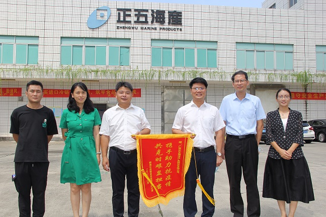 2022年8月31日上午,銀海區(qū)委副書記趙京峰來到正五海產(chǎn)公司,將一面“攜手助力抗疫情 共克時艱顯擔(dān)當(dāng)”的錦旗贈送到公司總經(jīng)理崔小祥手中,感謝正五海產(chǎn)公司在疫情期間捐贈物資的大愛情懷。