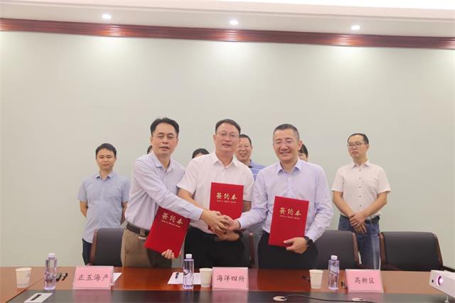 海洋四所紀(jì)委書記周雄,高新區(qū)黨工委書記、管委會(huì)主任梁小雄,正五海產(chǎn)公司副總經(jīng)理上官云山出席儀式并簽署合作協(xié)議。