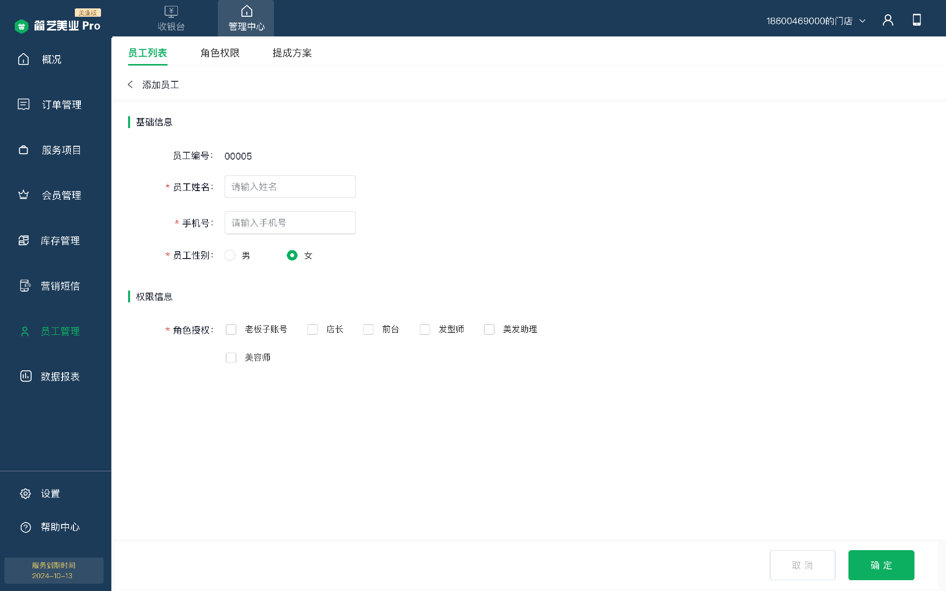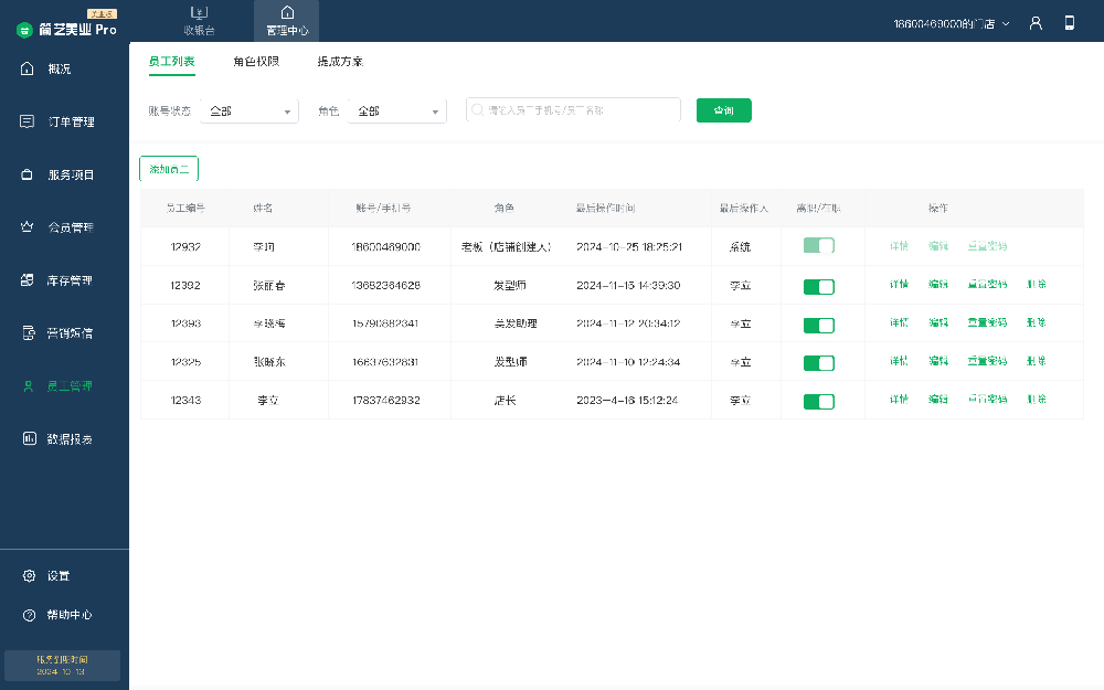 1.員工列表:主要用于員工的管理與操作,如門店有新員工入職時,可添加員工并設置對應的角色權限