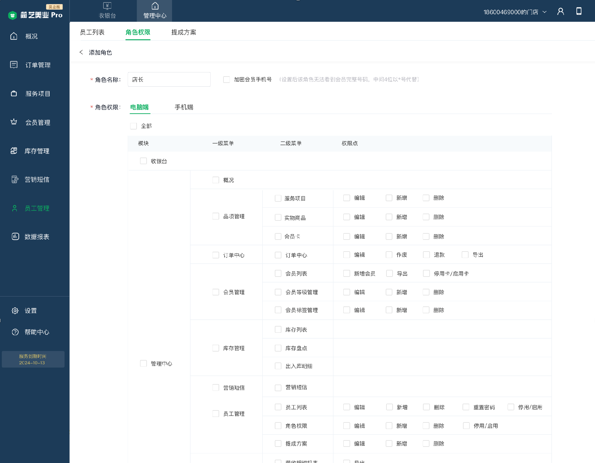 2.角色權限:根據門店情況創(chuàng)建崗位角色,如發(fā)型師、技師、店長等,并為角色勾選相對應的權限,未勾選的權限員工無法使用